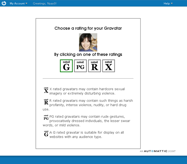 A G rated gravatar is suitable for display on all websites with any audience type. (gravatarと評価される1Gは、どんな観衆タイプででもすべてのウェブサイトで表示にふさわしいです。)