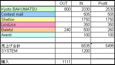 商品を置いている箇所は6ヶ所。内、お家賃をお支払いしているのは京都幕末とコンテストモール、Balefulさんの3店。(でも今月分のコンテストモールさんはサービス期間で無料)
