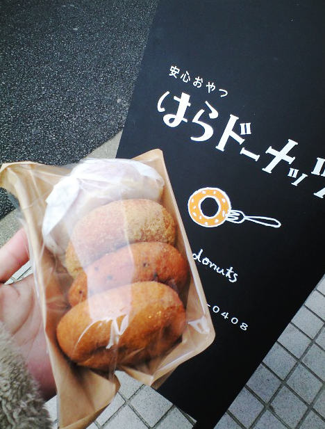 今揚がったばかりのプレーン(はらどーなっつという)を、はじめサトウキビとごま、日替わりメニューのみかんを購入しました。