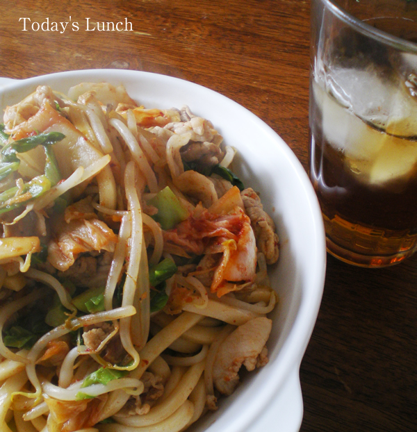 普通のお醤油系焼きうどんにキムチを投入し、代わりといってはなんだけどお醤油不使用。
